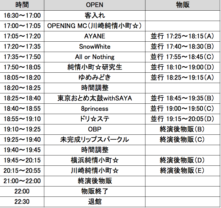 出演 川崎純情小町☆/横浜純情小町☆/8princess/OBP/未完成リップスパークル/ドリ☆ステ/東京おとめ太鼓 with SAYA/ゆめみどき/All or Nothing/SnowWhite/AYANE/純情小町☆研究生