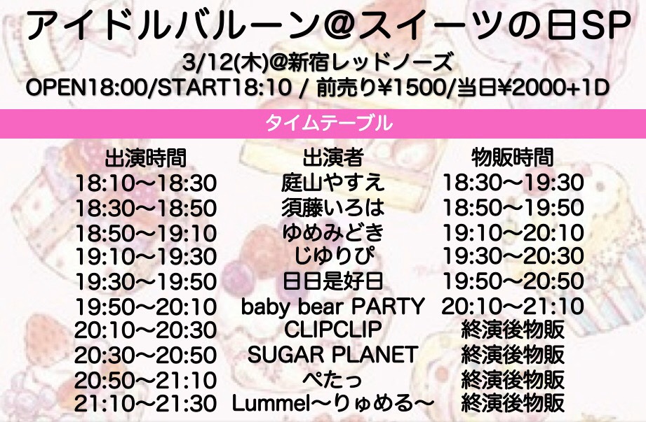 アイドルバルーン@スイーツの日SP ※ご来場時・物販特典会時はマスクの着用をお願い致します。 会場 新宿レッドノーズ 住所 東京都新宿区歌舞伎町1丁目2−1 予約1500+D 当日2000+D 開場18:00 開演18:10 18:50~19:10 ゆめみどき 19:10~20:10 併行物販特典会 エラー: コンタクトフォームが見つかりません。