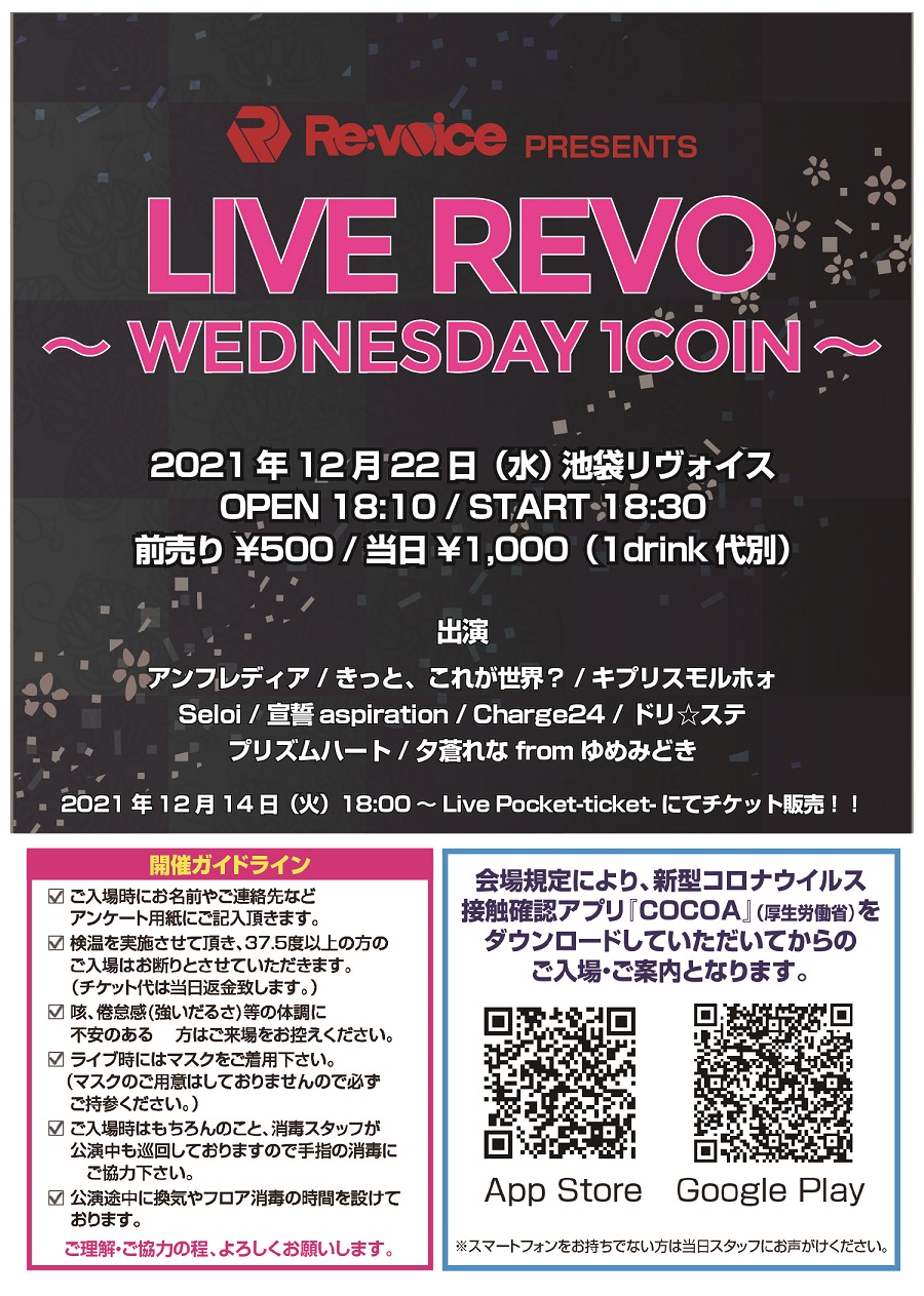 会場 池袋リヴォイス 住所 東京都豊島区池袋2‐12‐9 廣瀬ビルB1F 前売500+D 当日1000+D ライブポケット https://t.livepocket.jp/e/revo1coin20211222 18:10開場 18:30開演 18:45~19:00 夕蒼れな 19:05~20:05 併行物販特典会